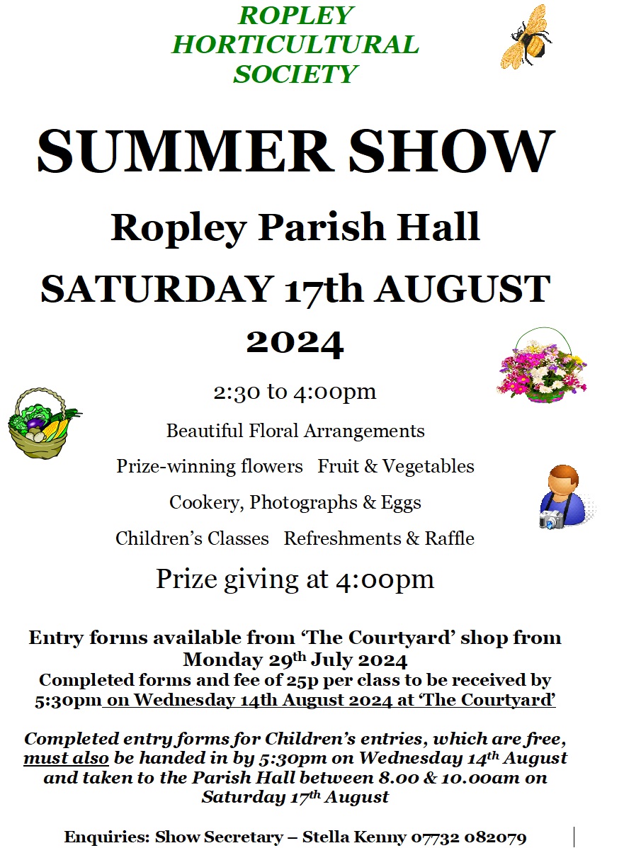 When August 17, 2024 2:30 pm - 4:00 pm Add To Calendar Download ICS Google Calendar iCalendar Office 365 Outlook Live Where Ropley Parish Hall Ropley Parish Hall, Ropley, Alresford, Hampshire Event Type Standard