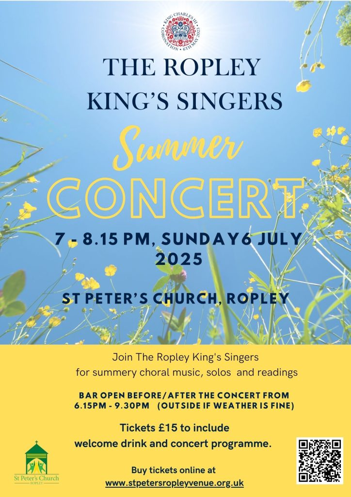 When July 6, 2025 7:00 pm - 8:15 pm Add To Calendar Download ICS Google Calendar iCalendar Office 365 Outlook Live Where St Peter's Church St Peter's Church, Ropley, Alresford, Hampshire Event Type Standard More details here: https://www.stpetersropleyvenue.org.uk/the-ropley-kings-singers-summer-concert Sally Palmer